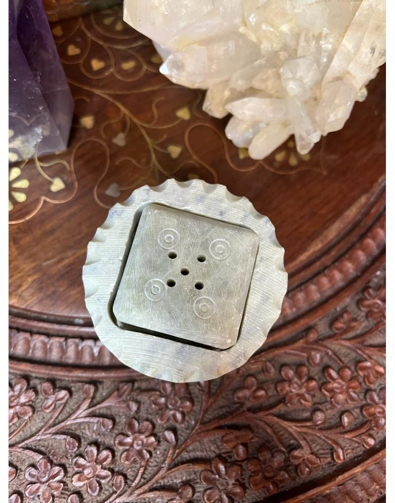 Stojan na tyčinky vyrobený z kameňa v šedej farbe s bielymi ornamentami. Kocka v strede stojanu v tvare slzy sa dá otáčať. Z každej strany je na nej iná veľkosť otvoru takže stojan je vhodný aj na iné druhy sviečok.