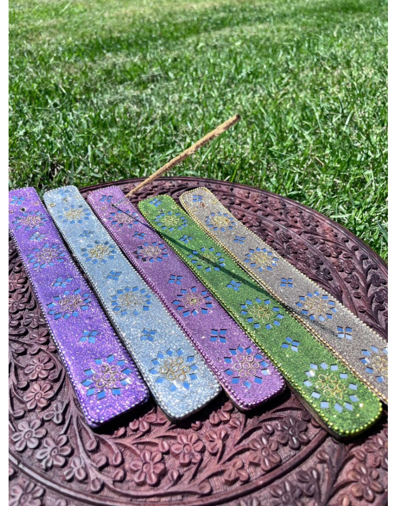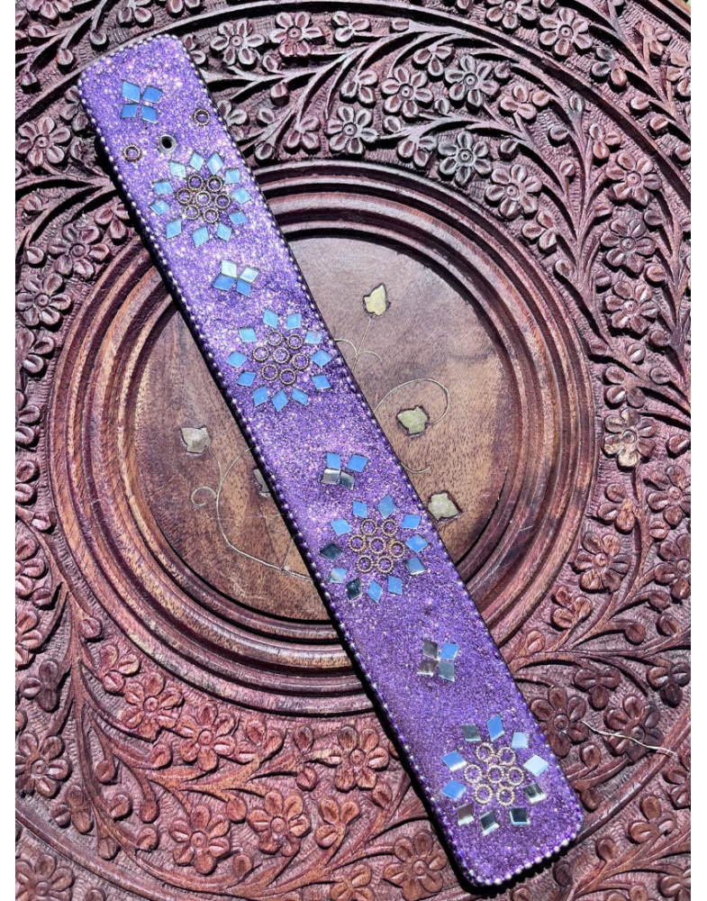 Podstavec pod zapálené vonné tyčinky ornamentový, trblietavý so sklíčkami. Farba fialová.